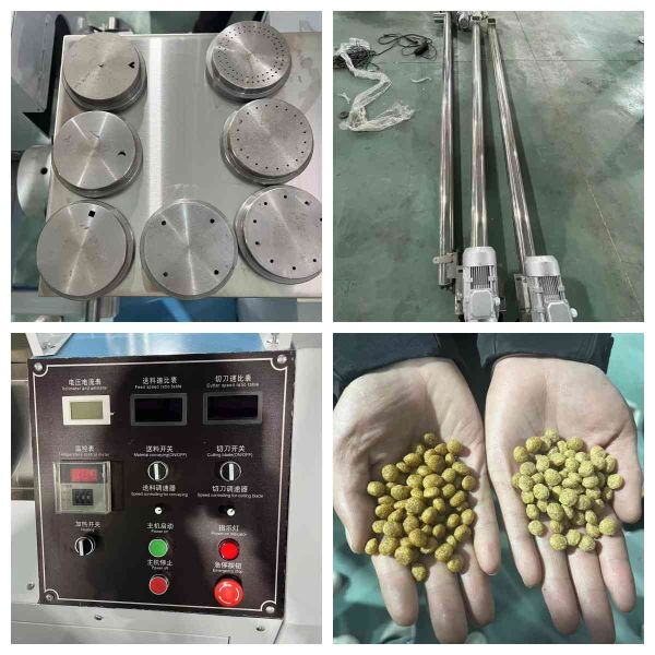 Pellet feed extruder equipment. A variety of flower shapes can be produced, and molds can be customized according to requirements. The product outlet is equipped with a frequency conversion speed regulating rotary cutting device, which can adjust the blade rotation speed arbitrarily to control the cutting speed and length.